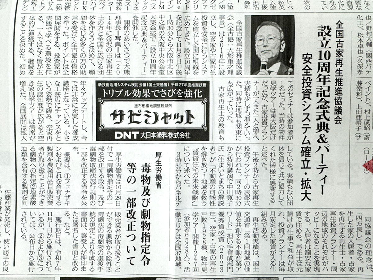 このたび、業界専門紙「塗料報知」2025年12月7日号に、(一社)全国古家再生推進協議会 設立10周年記念フェスおよび記念式典の取り組みをご掲載いただきました。