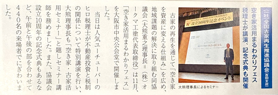 このたび、大阪シティ信用金庫の機関誌「せんだぎ」2025年12月号に、(一社)全国古家再生推進協議会 設立10周年の取り組みについてご掲載いただきました。